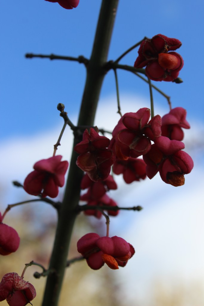 It is now mid-autumn and seasonal gales have cast the remaining leaves to the ground. Whilst out walking alongside a small woodland, I notice some fine crimson leaves and the familiar pink haze of a spindle tree shimmering against the crisp blueness of an autumnal sky.